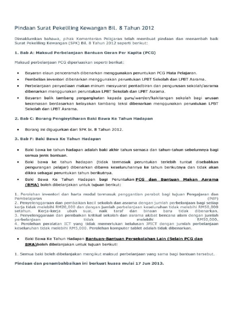 Sekolah yang mula beroperasi mulai 1 julai. Pindaan pekeliling kewangan bil 8 tahun 2012.pdf. Bantuan kokurikulum ini baru sahaja wujud sejak tahun 2012 (rujuk pekeliling bil 8/2012). Peruntukan bantuan persekolahan ke sekolah berdasarkan per kapita. Garis panduan perancangan pengenalpastian bagi pembangunan semula kawasan brownfield.
