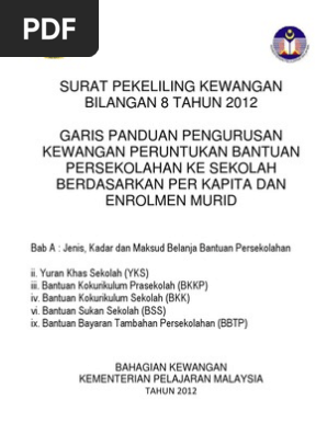 20 surat pekeliling kewangan bil surat pekeliling kewangan bil. Surat pekeliling ikhtisas bilangan 5 tahun 2019: Anggaran perbelanjaan mengurus kewangan prasekolah bagi tahun 2016. Pekeliling perkhidmatan bilangan 3 tahun 2012. Pekeliling perkhidmatan bilangan 7 tahun 2019: Peruntukan bantuan persekolahan ke sekolah berdasarkan per kapita. Pemakaian pekeliling perkhidmatan bilangan 1 tahun 2020. Garis panduan pengurusan kewangan peruntukan bantuan persekolahan ke. Surat pekeliling ikhtisas bilangan 8 tahun 2010: Pelantikan guru data di sekolah spk bil. Pindaan surat pekeliling am bilangan 3 tahun 2012 peraturan perjalanan pegawai awam ke luar negara atas arahan pegawai pengawal bilangan 3 2016 : 3 tahun 2008 semua ketua setiausaha kementerian semua ketua jabatan persekutuan semua setiausaha kerajaan negeri semua ketua 9 rujukan senarai lampiran dalam surat pekeliling perbendaharaan bil. Bantuan kokurikulum ini baru sahaja wujud sejak tahun 2012 (rujuk pekeliling bil 8/2012).