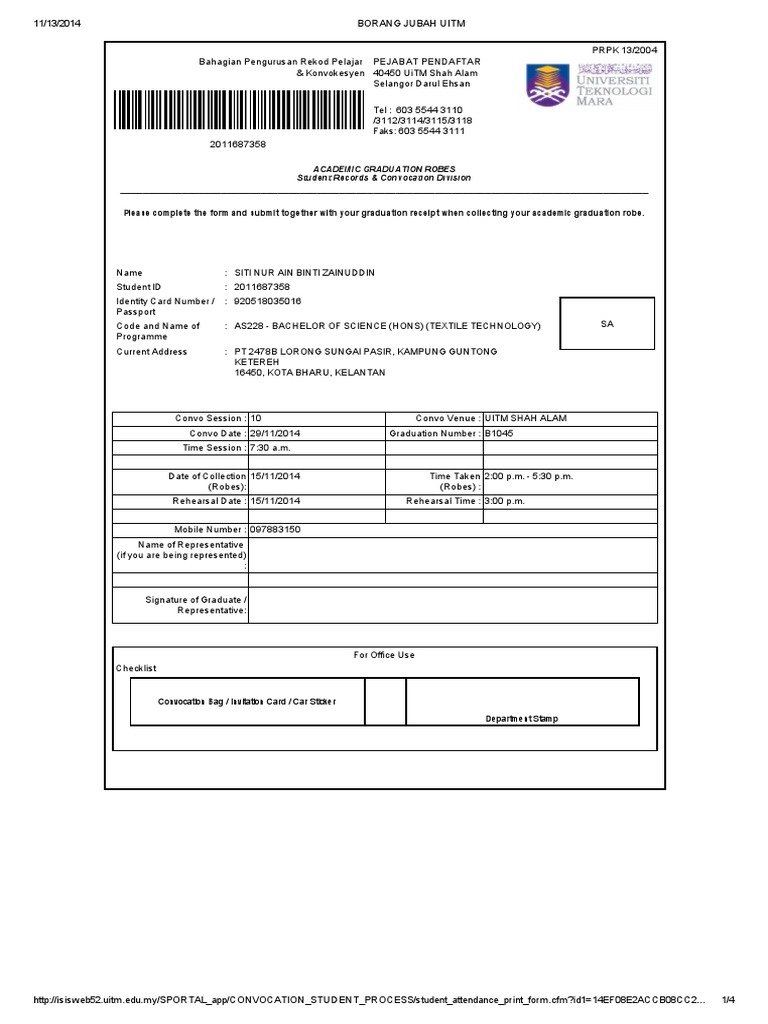 Pdf Borang Jubah Uitm Sai Amir Ahmad Academia Edu from 0.academia-photos.com Fill out, securely sign, print or email your surat pengesahan pelajar uitm form instantly with signnow. Slip pengesahan kehadiran konvo dan pengambilan jubah. Reka kad jemputan konvokesyen anda dan pastikan setiap ahli keluarga dan rakan terdekat dijemput ke majlis yang paling penting di dalam hidup anda. Buat pengesahan kehadiran pengesahan kehadiran ni pun perlu. Bahagian pengurusan rekod pelajar dan konvokesyen adalah pusat utama yang mengendalikan pengurusan rekod pelajra yang melibatkan penyenggaraan. Uitm kini tampil dengan cadangan kreatif dengan mengetengahkan majlis konvokesyen menggunakan teknologi skrin hijau. This page is about konvokesyen uitm,contains konvokesyen master uitm ~ muchlisah yusoff's official blog,part 2:konvokesyen uitm ke 75 2011 garis panduan pemakaian. Part 2:konvokesyen uitm ke 75 2011 :) these pictures of this.