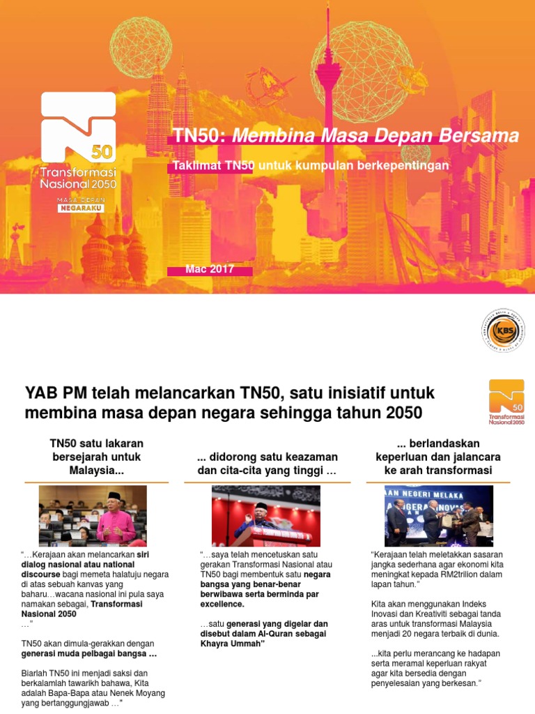 Transformasi nasional 2050 by syna bg. Ciri ciri utama transformasi nasional 2050 tn50 ialah. Transformasi nasional 2050 tn50 yang dilancarkan perdana menteri tahun lalu adalah aspirasi memacu masa depan negara dari 2020 hingga 2050. Ciri ciri utama tn50 dan kumpulan sasar 5 aspirasi seluruh rakyat malaysia dari pelbagai. Transformasi nasional 2050 (atau tn50) merupakan satu inisiatif pembangunan negara yang merangkumi tahun 2020 hingga 2050.inisiatif ini akan dipacu oleh matlamat dan sasaran yang jelas selama 30 tahun, yang akan dibangunkan melalui proses perundingan dalam fasa persediaan dari tahun 2017 hingga 2019.
